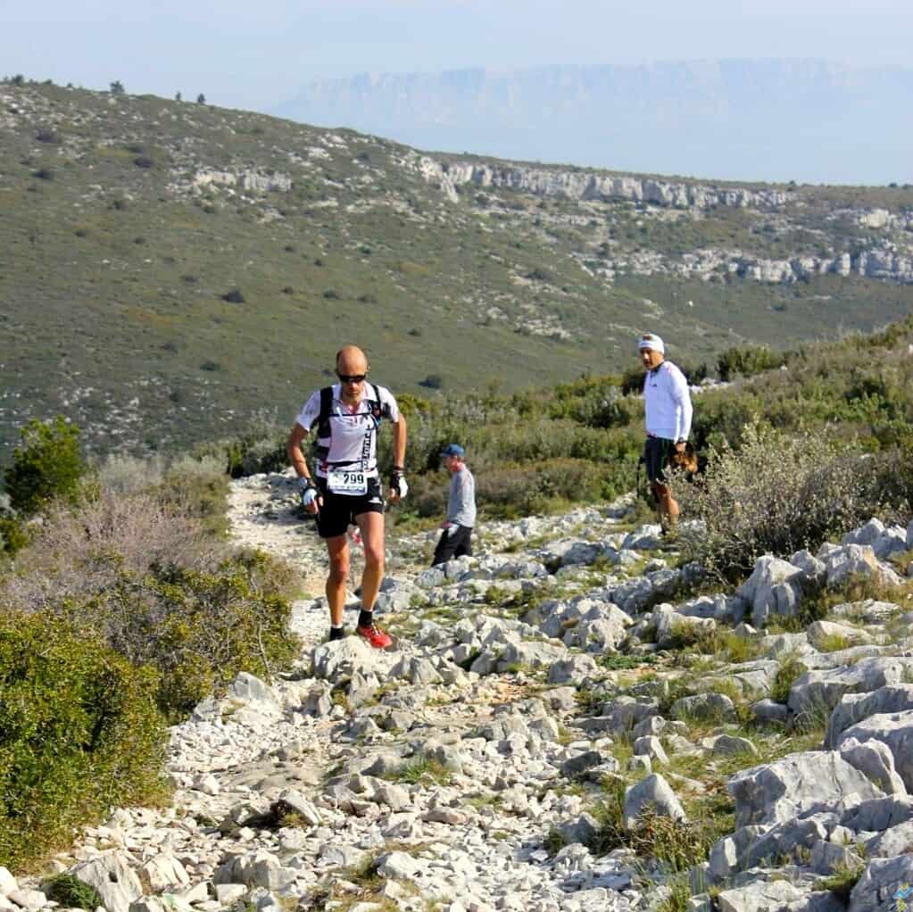 En haut du premier col je me retrouve avec Sébastien Nain. Nous restons ensemble pendant un bon moment, jusqu’au pied de la seconde difficulté, la montée de Garlaban. A ce moment là, je suis 12ème. J’ai en visuel un coureur juste devant, je le double au début de l’ascension et l’encourage à s’accrocher. Sébastien qui a une douleur au genou est resté en arrière. Je me retourne, personne à 500 mètres. Tout va bien ! Arrivé au sommet du Garlaban à 716 mètres d’altitude, le panorama est magnifique, ça fait du bien de courir sur ses terres. Un petit coucou à mon ami Stéphane Quantin du team Roquetrail Attitude qui est bénévole sur la course et qui se trouve là.