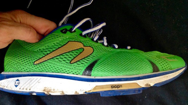 La Gravity V pèse un tout petit peu moins de 280 grammes en taille 44. Le drop est réduit, 3mm. La semelle est munie d’une plateforme P.O.P.1 sous le milieu du pied pour favoriser une course naturelle. (Il s’agit de cinq lamelles en plastique, une sous chaque métatarse, le tout formant une plateforme de 4 millimètres d’épaisseur environ)